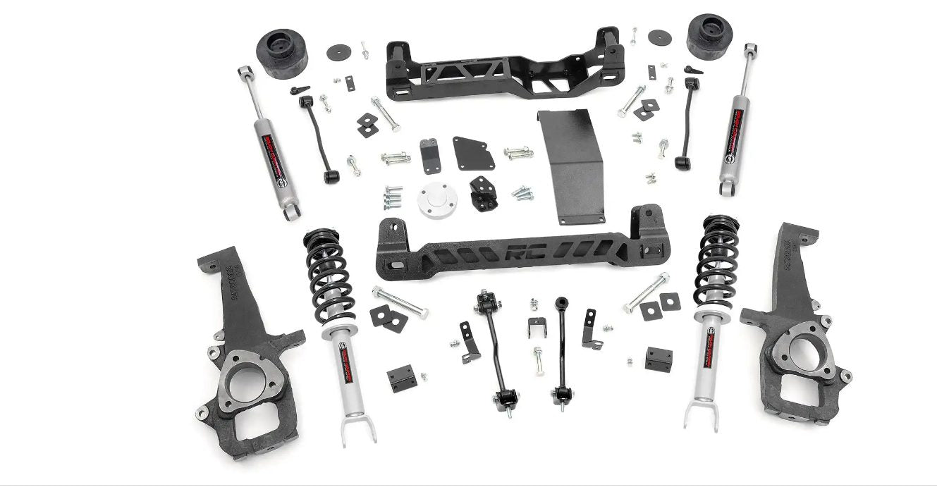Rough Country's 4-inch Bolt-On Kit offers easy installation and aggressive good looks at an incredible value. Take your truck to new heights with this excellent option for RAM 1500 pickups. Levels the front and rear of the truck Can be returned to stock Includes pre-loaded coil Maintains smooth, factory-like ride Increased ground clearance Engineered for lifted applications Infinitely Variable Damping Give your RAM 1500 the perfect blend of performance, protection, and style with Rough Country's 4-inch Suspension Lift. Designed to offer an affordable way to maximize off-road performance and run up to 35-inch tires, these kits offer high quality, heavy-duty equipment for new model RAM 1500’s Silver powder coat finish