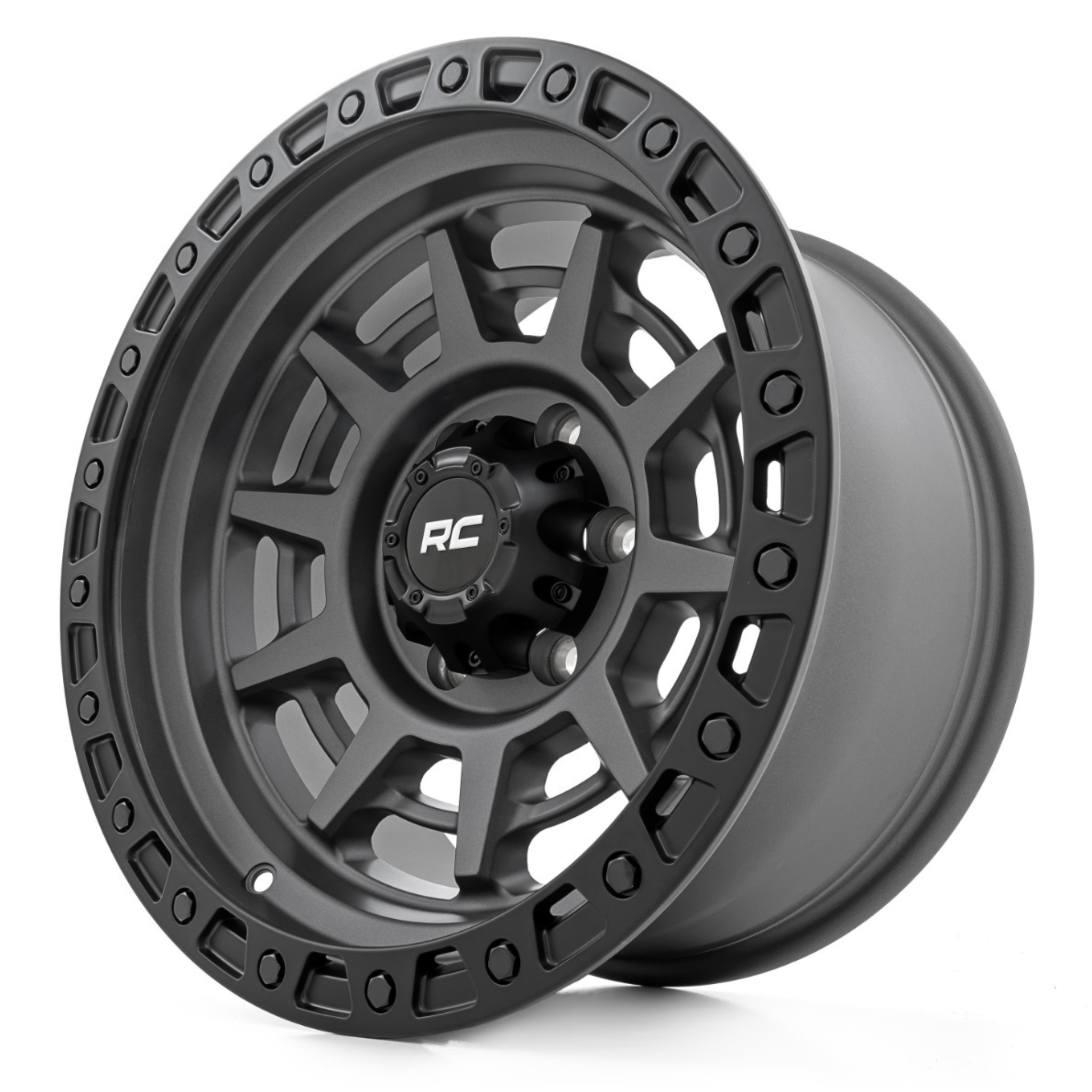 These gunmetal gray color wheels boast an aggressive design and include a Rough Country black center cap, so you can tackle the road in style.