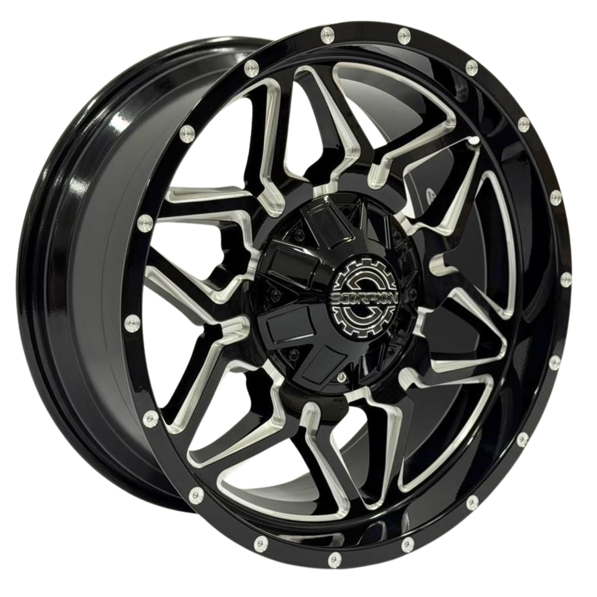 The SC16 features a full gloss black finish with milled spoke edges, giving a sharp, aggressive look that suits modern 4x4s perfectly. A great mid-offset option for vehicles running flares.